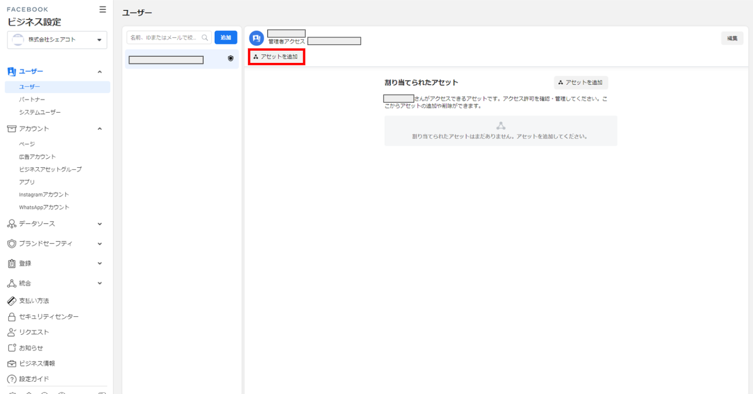 続いて、ビジネスマネージャ内のメンバーにそれぞれ管理権限を付与します。