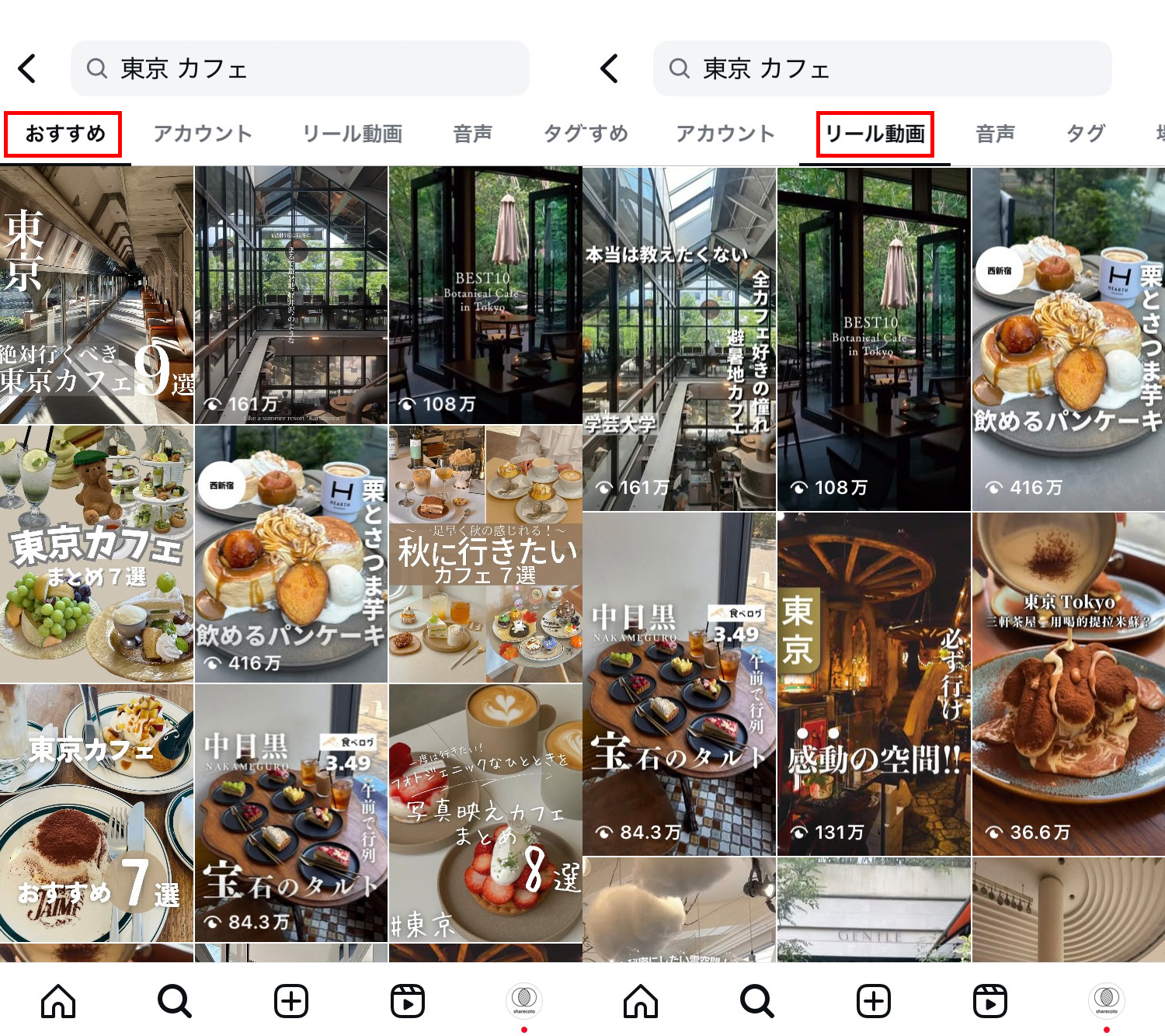 リールのクリエイターを探す場合、「リール」タブに切り替えれば、動画制作に強いアカウントを効率的に見つけられます。