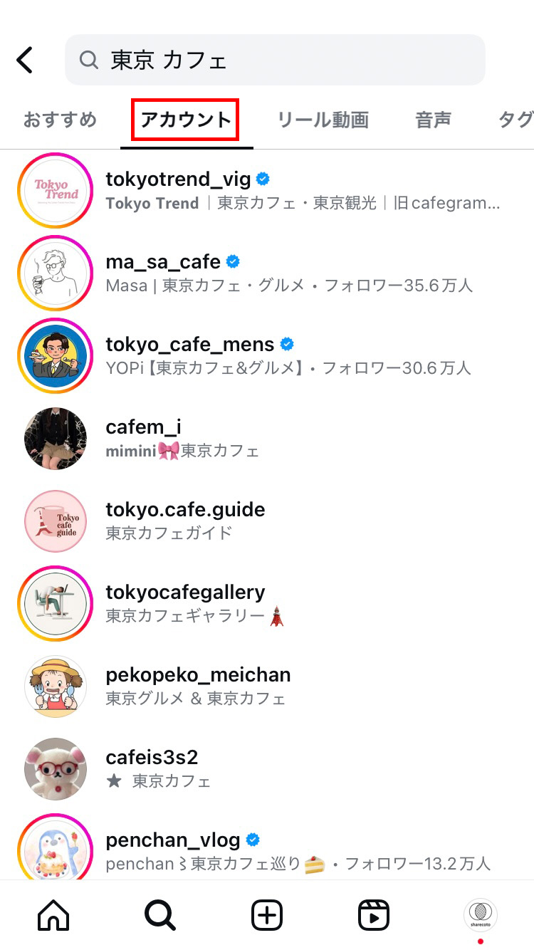 検索タブを「アカウント」に変更すると、入力したキーワードに関連するユーザー一覧が表示されます。