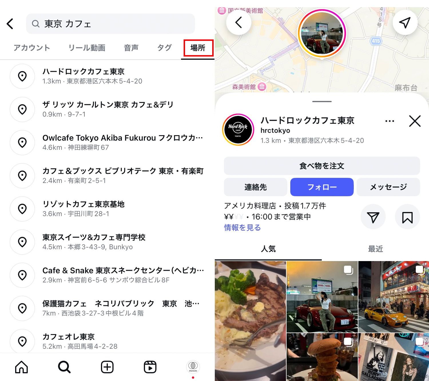 検索ページを横にスワイプして「場所」タブを選び、気になるキーワードを入力。
