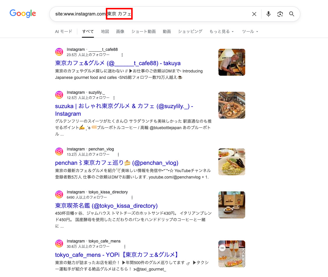 そんなときはインターネット検索で「site:www.instagram.com 〇〇」という形式を使うと〇〇に関連するアカウントを一覧でチェックできます。