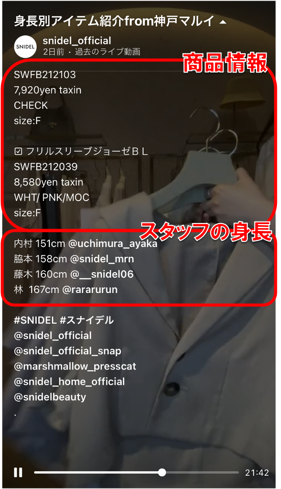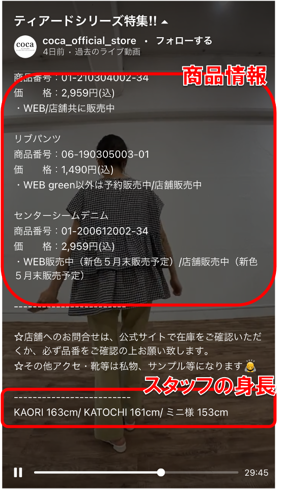 ECサイトやフィード投稿だけでは伝わりづらい着用イメージが沸きやすいのがインスタライブの大きな特徴です。サイズの記載・着用するスタッフの身長などをキャプションに記載すると、より視聴者に寄り添った配信となるでしょう