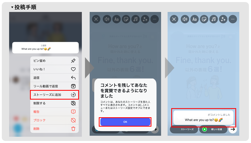 新しく投稿のコメントをストーリーズでシェアできるようになりました。