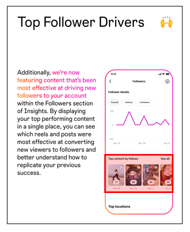 インサイトの「フォロワー」セクションに、新規フォロワー獲得に最も効果的だった投稿が表示されるようになりました。