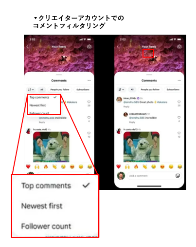 フォロワーが10万人を超えるクリエイターアカウント向けに、コメントフィルタリングツールが追加されました。これにより、投稿へのコメントを「トップコメント」「最新順」「フォロワー数」などの基準で並べ替えることができるようになりました。