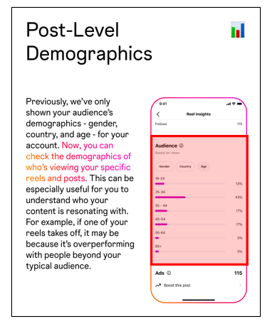 個別のリールや投稿ごとに視聴者の年齢層などのユーザー属性データが表示されるようになりました。